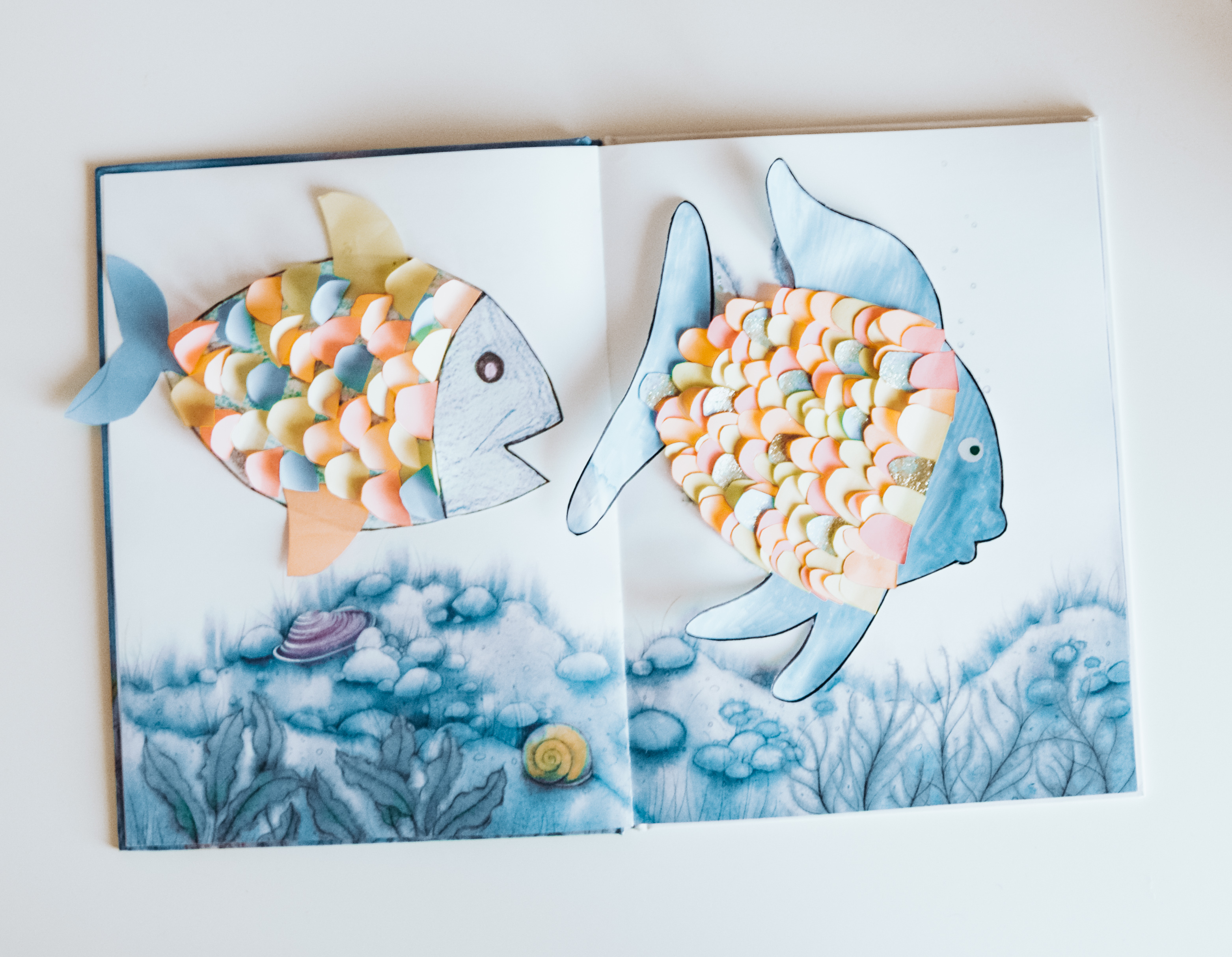 Dacă Peștele-curcubeu este cel mai frumos din ocean, ne-am propus să realizăm și noi un peste din post-it-uri colorate însă am avut grijă să umăm cu atenție modelul din carte. I-am atașat chiar și slipici pe unii solzi.