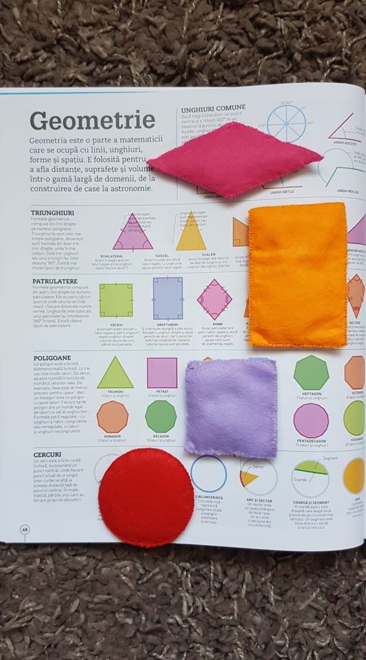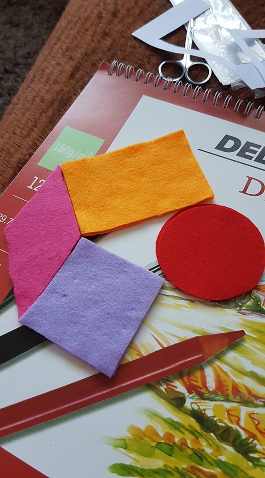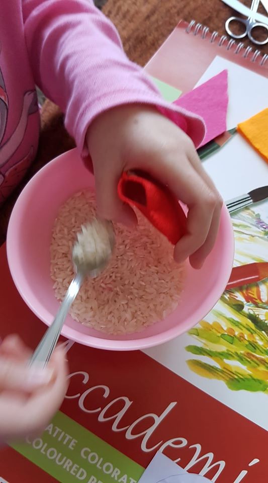 „Nu am avut plastilină așa că D. a propus să facem forme geometrice din material și să le coasem. Căutând după faină, mă gândeam că poate am ceva expirată, am dat peste orez expirat, deci au rezultat forme geometrice senzoriale.”