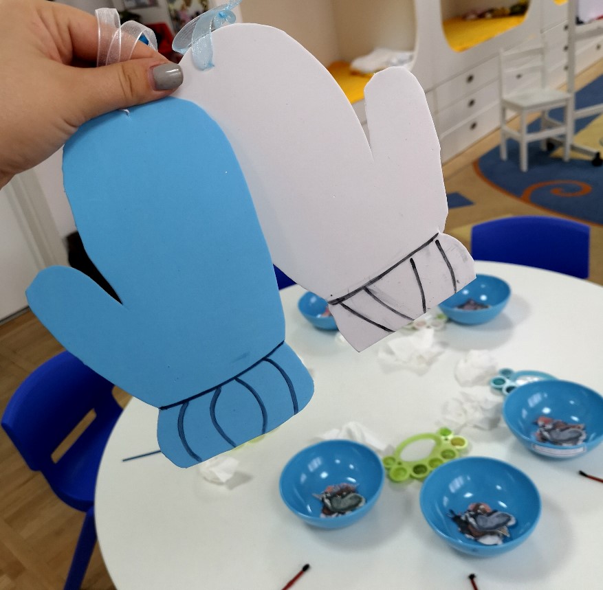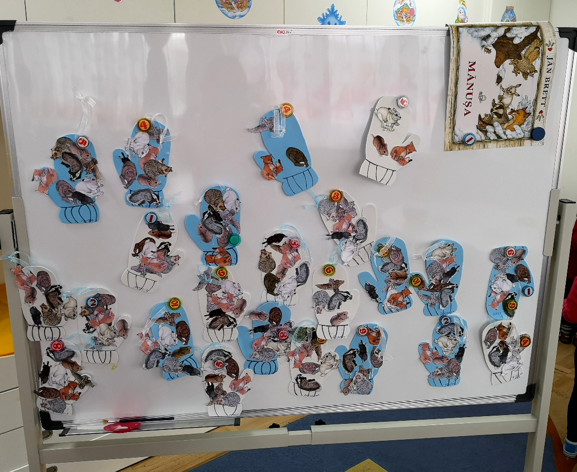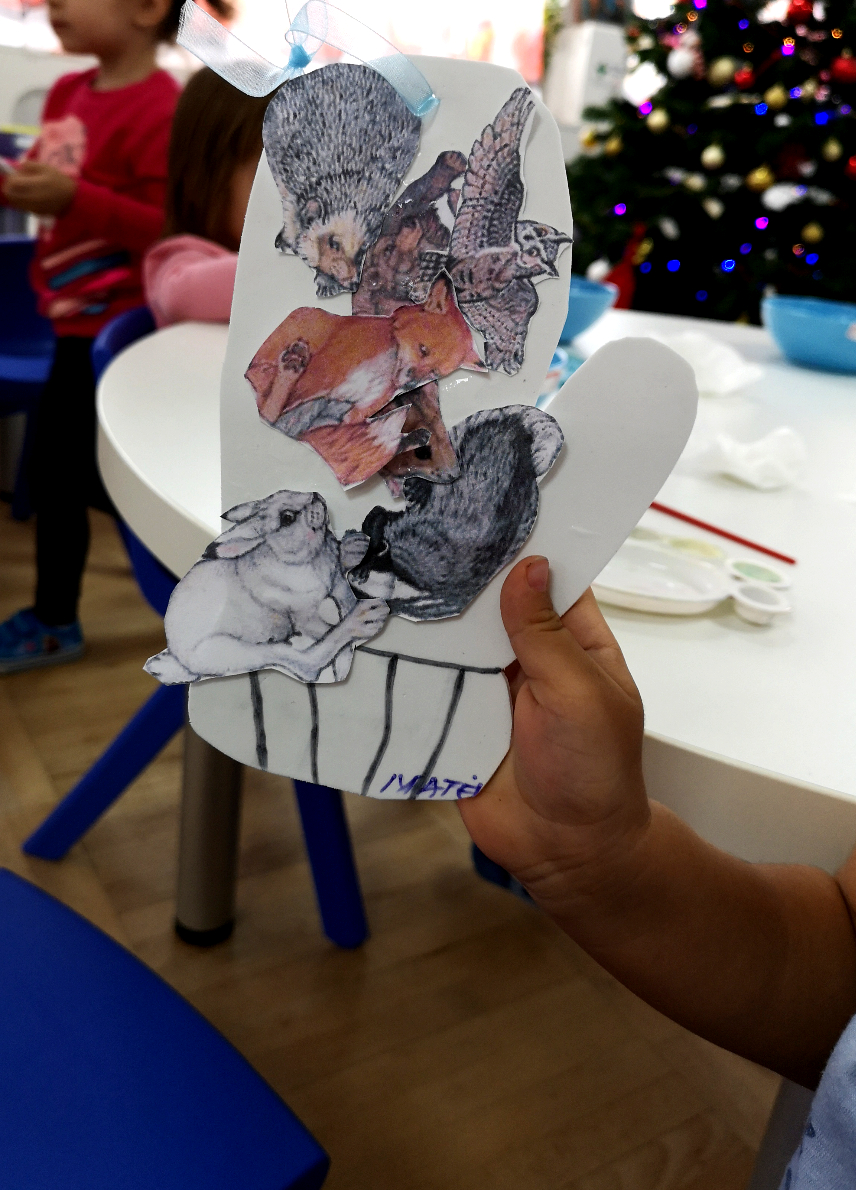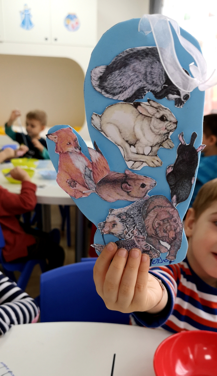 După ce am terminat cu povestea, a început partea interactivă – atelierul de creație realizat pe baza basmului „Mănușa”. Fiecare copil a primit câte o mănușă confecționată din hârtie gumată, toate cele opt animale din poveste decupate din hârtie, lipici și o pensulă. Tema atelierului era ca fiecare să realizeze un colaj, lipind pe mănușa lui animalele preferate din poveste.