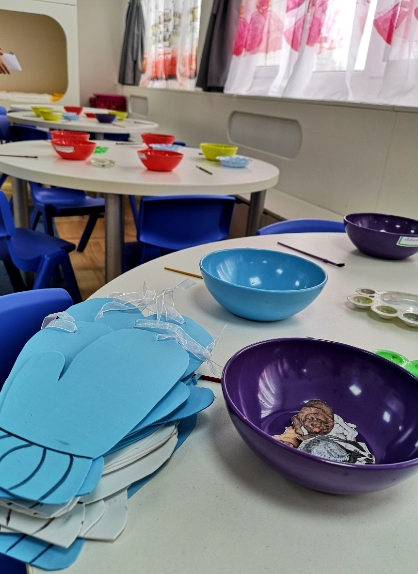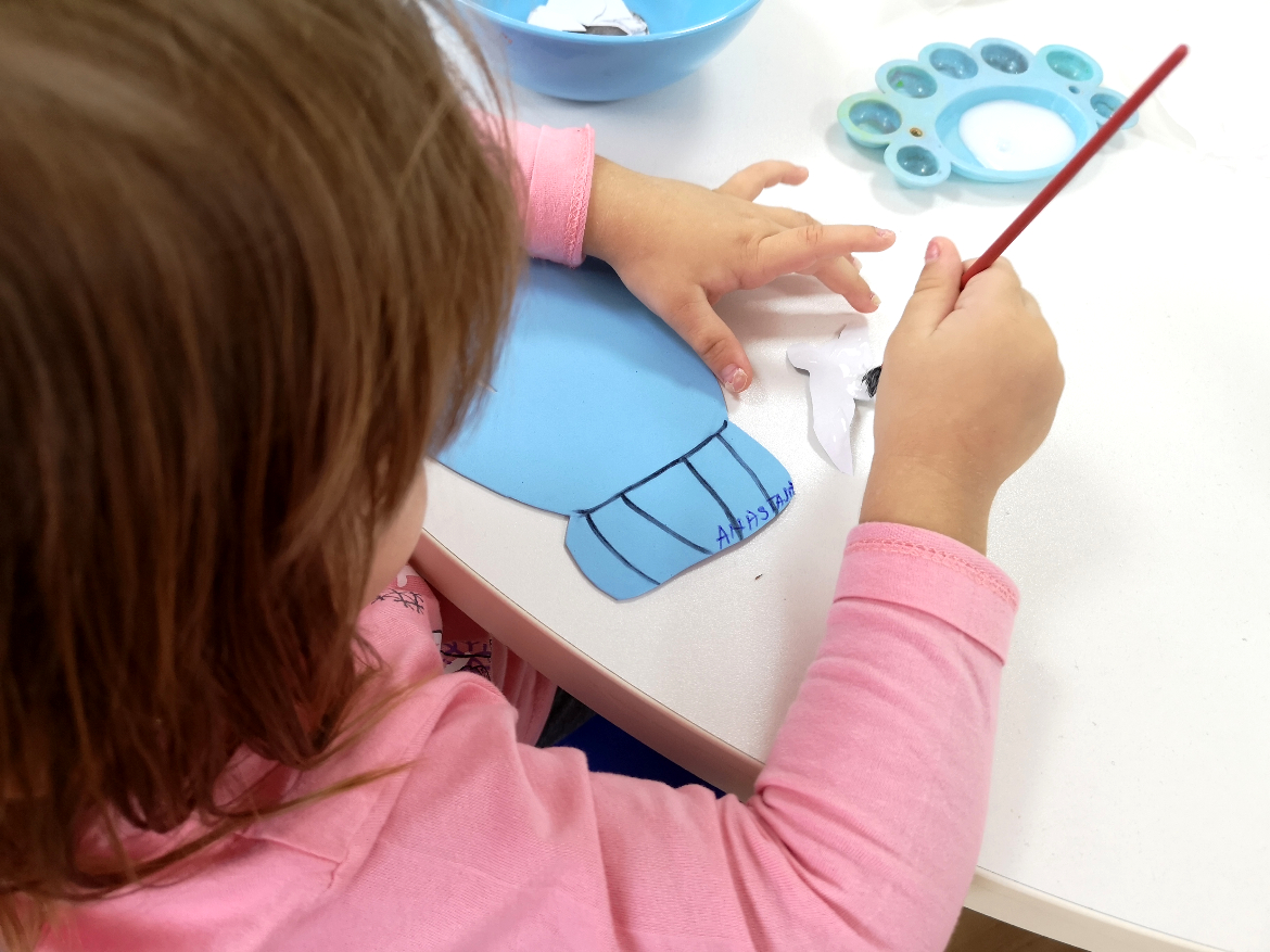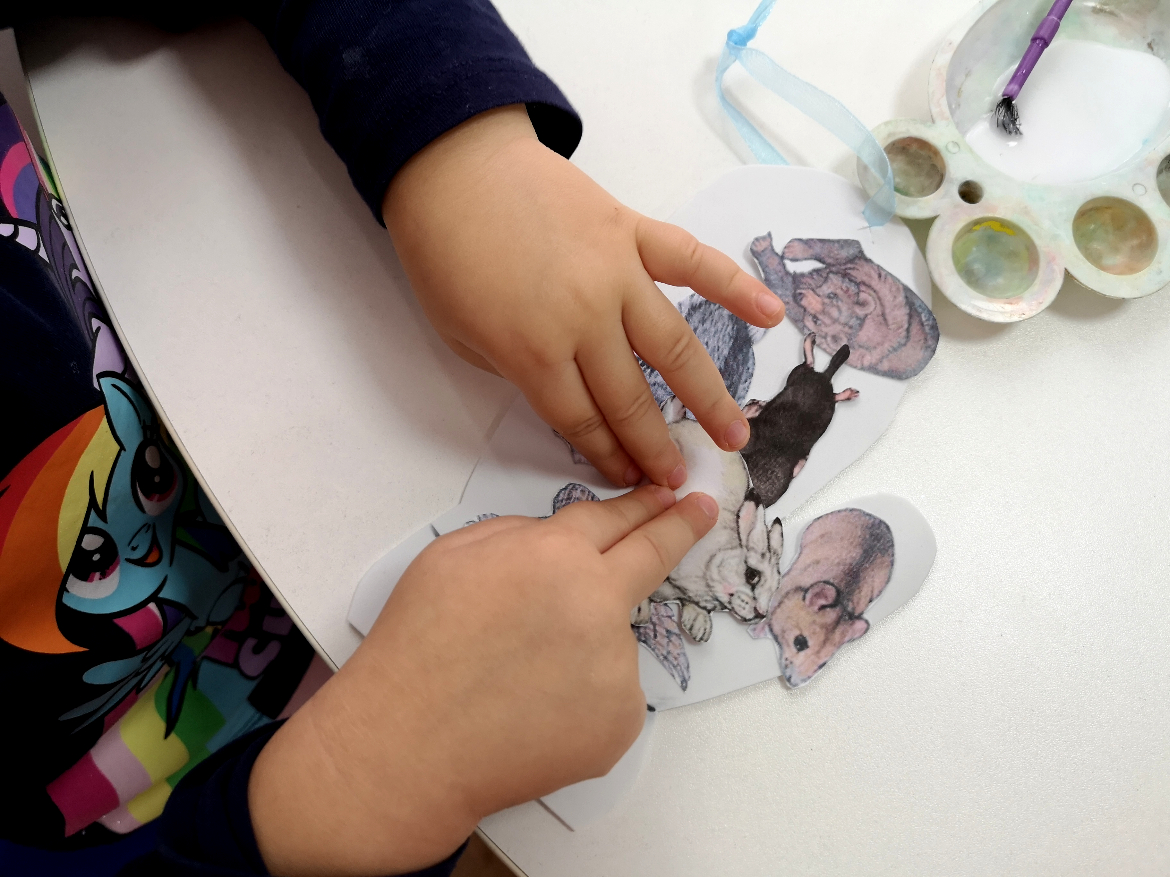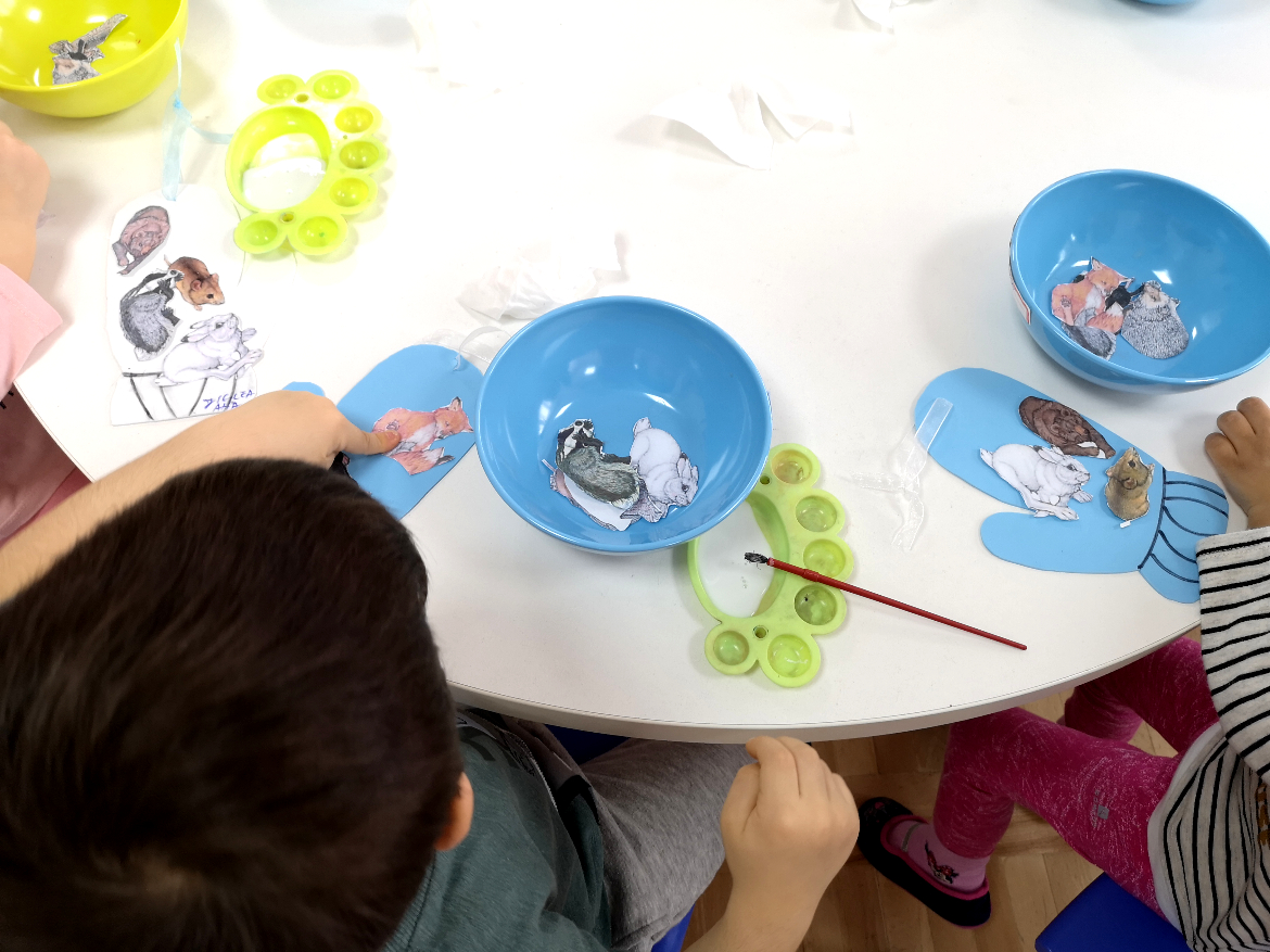 După ce am terminat cu povestea, a început partea interactivă – atelierul de creație realizat pe baza basmului „Mănușa”. Fiecare copil a primit câte o mănușă confecționată din hârtie gumată, toate cele opt animale din poveste decupate din hârtie, lipici și o pensulă. Tema atelierului era ca fiecare să realizeze un colaj, lipind pe mănușa lui animalele preferate din poveste.
