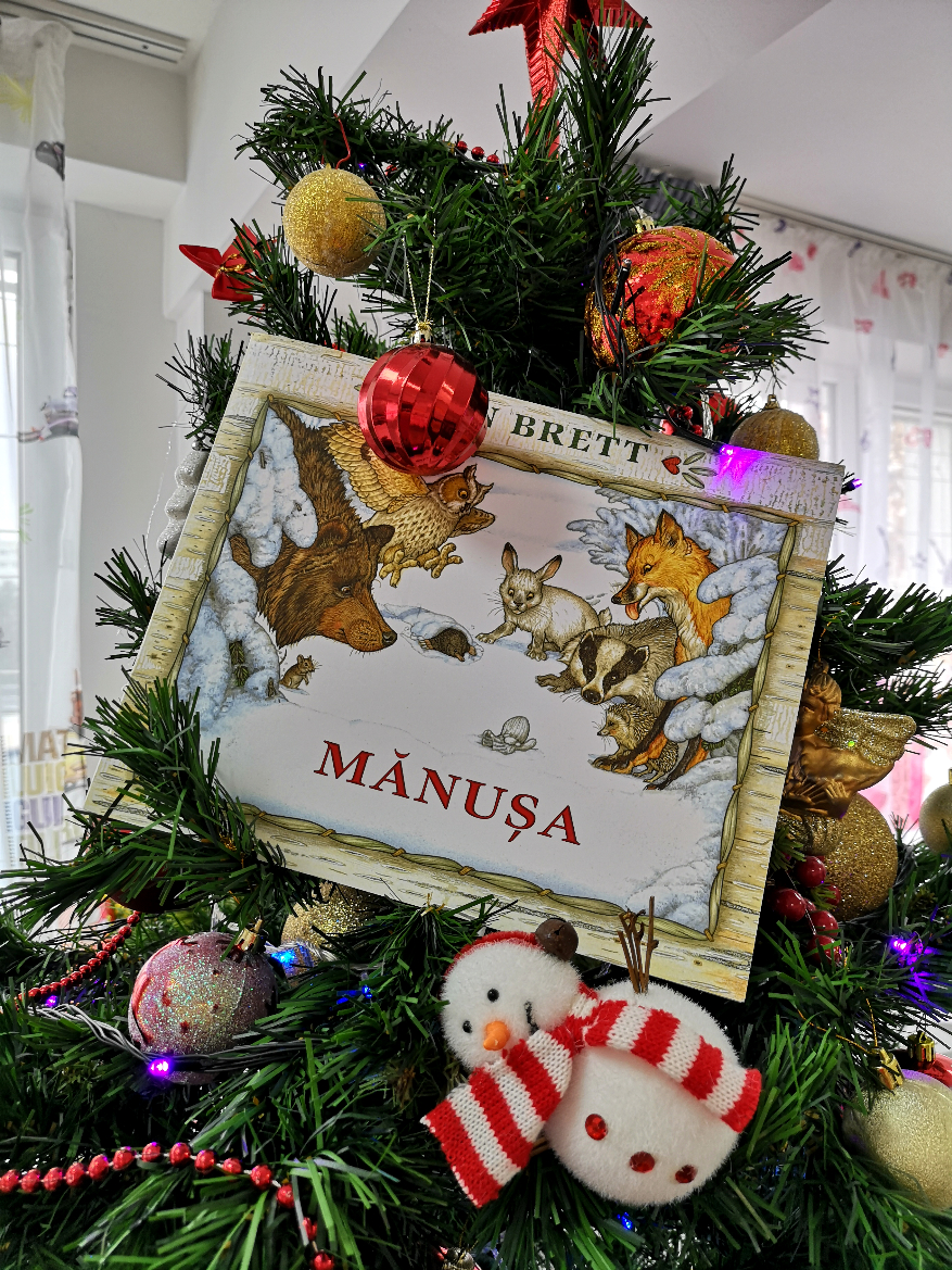 Astfel, sub îndrumarea doamnei educatoare ne-am strans toți într-un cerc și am început să citim basmul „Mănușa” de Jan Brett, proiectat de asemenea și pe un videoproiector pentru ca cei mici să se familiarizeze cu personajele din poveste. Am citit și am comentat, am răspuns curiozităților copiilor, iar ei ne-au spus pe înțelesul lor, ce s-a întâmplat în carte.