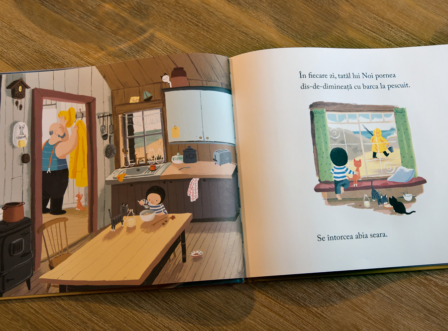 Universul lui Noi se rezumă la nisipul plajei, apa sărată a mării și nuanțele verzi-albăstrui care conturează peisajul, câteva creaturi marine, cele șase pisici ale sale de culori diferite și tatăl său înalt și solid, cu barbă gri, îmbrăcat cu o pelerină de ploaie galbenă. Pe lângă toate aceste detalii, Davies folosește o mulțime de elemente vizuale, însă păstrează cât mai minimalist trăsăturile faciale ale personajelor sale – două puncte pentru ochi și cele mai simple linii pentru nas și gură – oferind în schimb multe detalii despre îmbrăcăminte, gesturi și limbajul corpului.