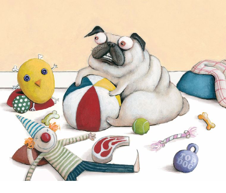 Mopsul Porc este un câine lacom și foarte egoist care locuiește într-un apartament cu prietenul său patruped, Trevor. Nici nu se pune problema ca Porc să împartă jucăriile cu Trevor sau să accepte măcar vreo propunere de acest fel. Cartea conține un mesaj important pentru cei mici și prezintă o lecție despre egoism și bucuria de a împărți cu ceilalți, toate într-o notă amuzantă.
