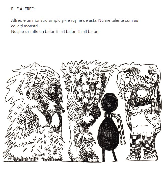 Povestea lui Alfred (Alfred, un monstru mult prea simplu publicată la editura Vlad și Cartea cu Genius în anul 2018) este simplă: fără aventuri prin furtuni neașteptate, răpuneri de balauri ori salvări cavalerești de prințese, fără inamici vicleni cu superputeri. El s-a născut din dorința de a reprezenta sensibilitatea într-o lume în care adsea uităm să fim sensibili. „Monștrii ar trebui să fie magnifici, viteji, înzestrați, teribili, tiranici, să sperie copii, să doboare eroi, să distrugă castele. Nu prea ne trece prin cap că sunt monștri care împletesc șosete la gura sobei și care nu vor nimic mai mult de la viață.”, spune Corina. Însă Alfred n-a auzit niciodată de lucrurile astea. Lui îi tulbură viața un singur gând: că nu e la fel ca monștrii din jurul lui.