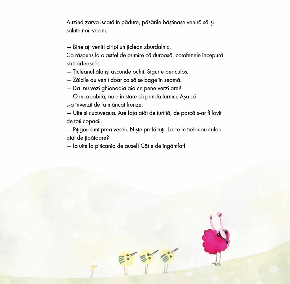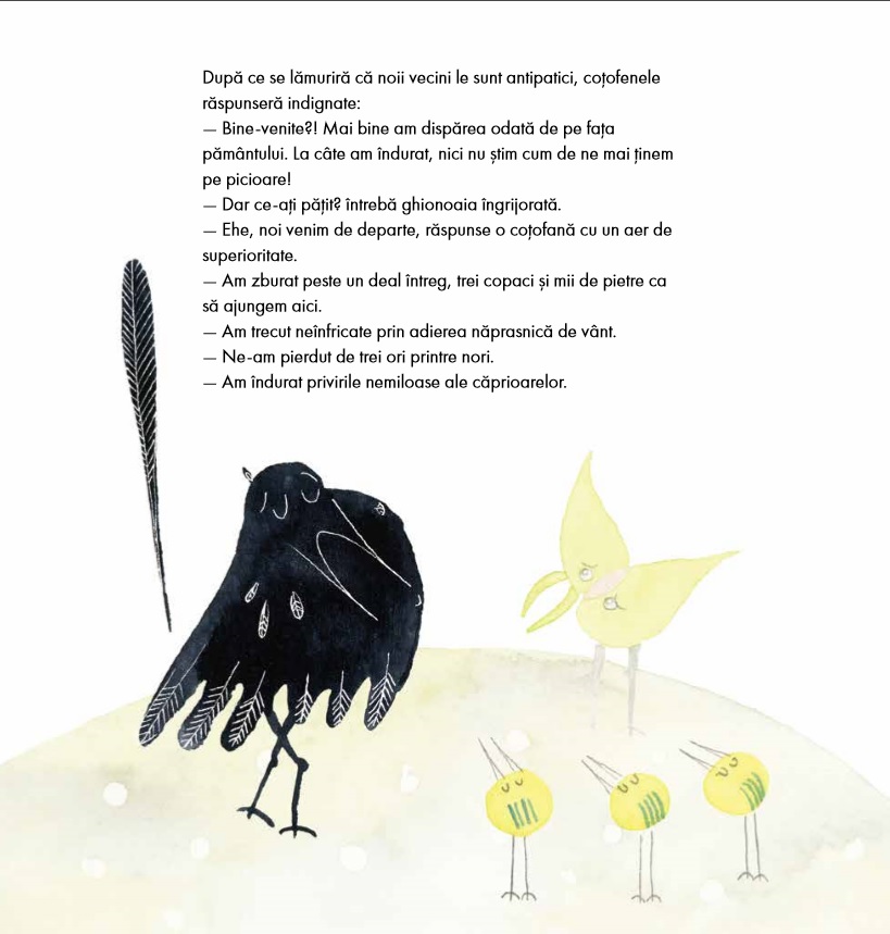 Coțofenele clănțănitoare din cartea scrisă și ilustrată de Oltea Enache sunt niște păsări veșnic îmbufnate. În timp ce-și caută un loc nou pentru cuibărit se întâlnesc cu niște păsări prietenoase. Vă invităm să citiți fragmentul de mai jos și să vă înscrieți la concursul de desen pentru copii.