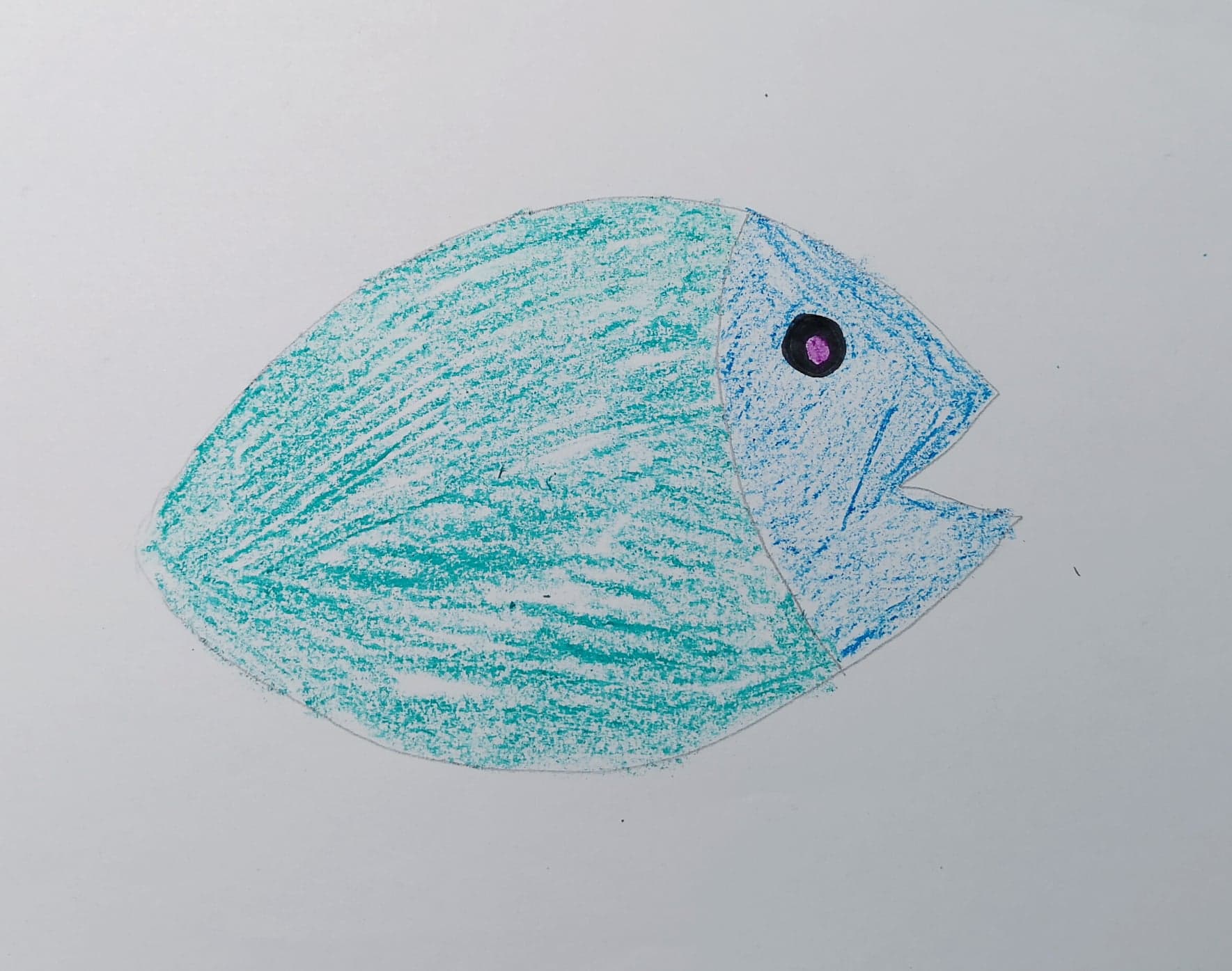 Pe coala albă desenăm forma unui pește. Nu trebuie să fie perfect. Noi am avut în vedere forma peștelui din carte, însă voi vă puteți folosi imaginația pentru a crea un pește diferit. Desenăm ochii, gura și îl colorăm în nuanțe de albastru.