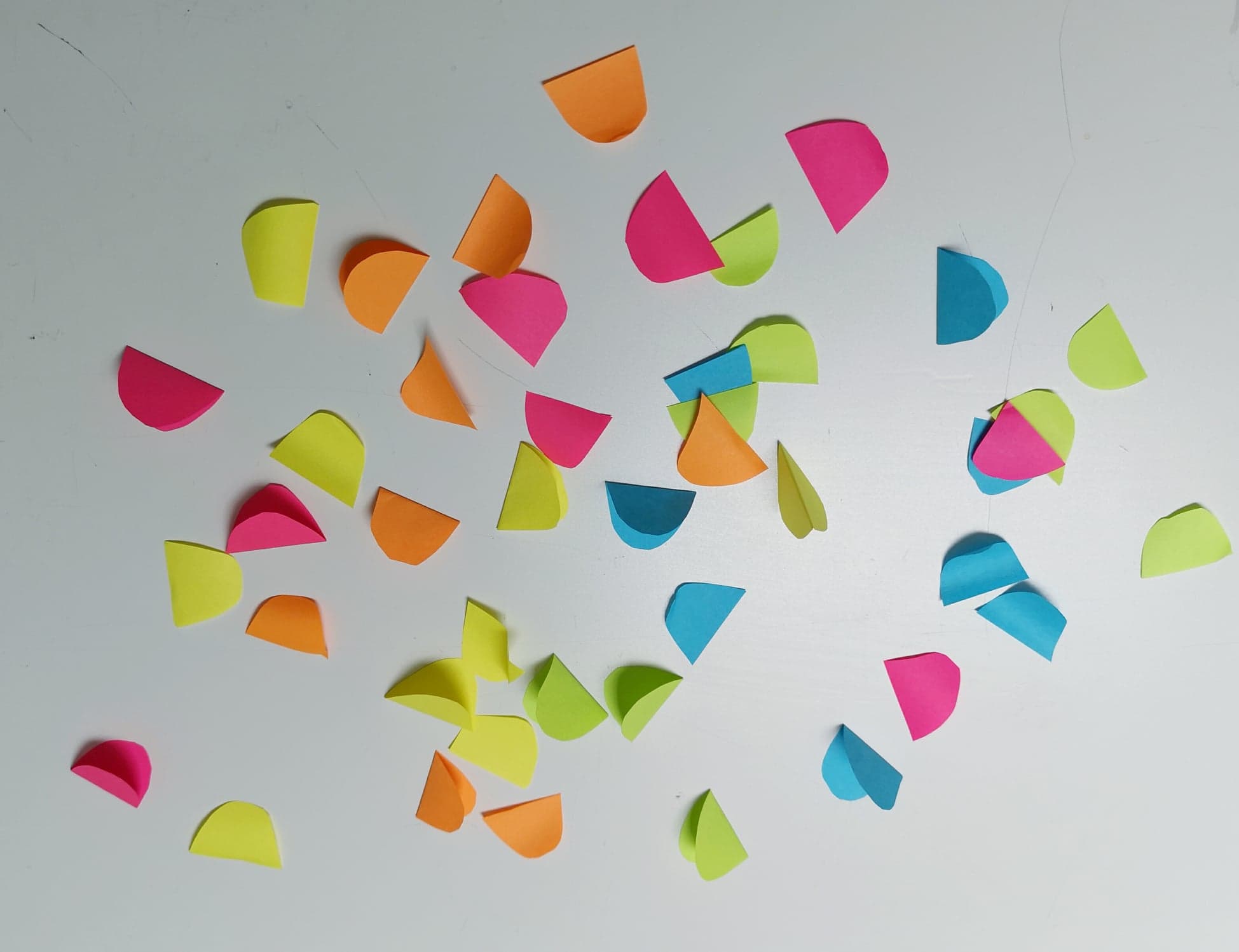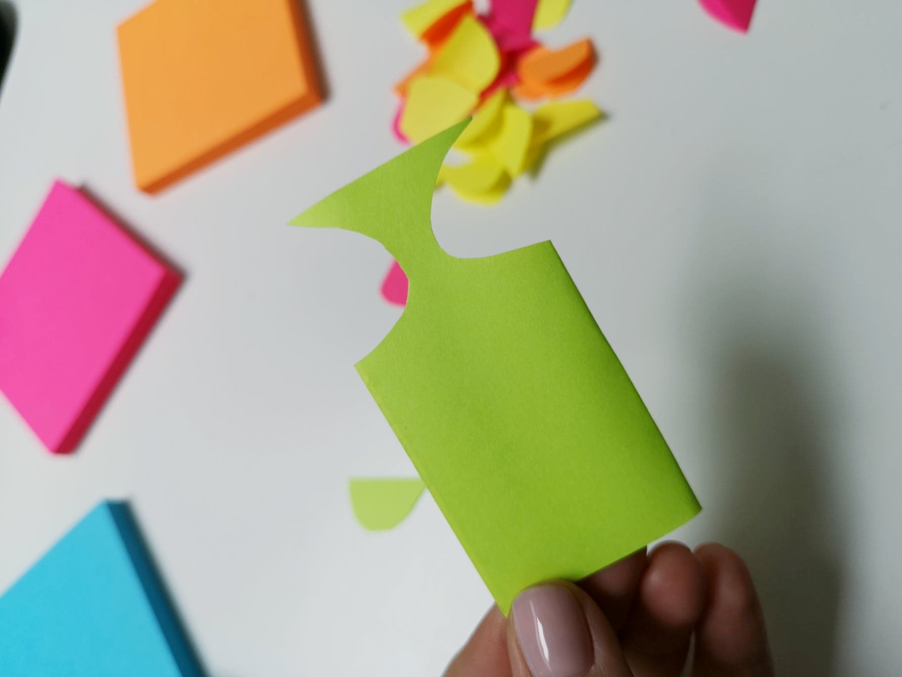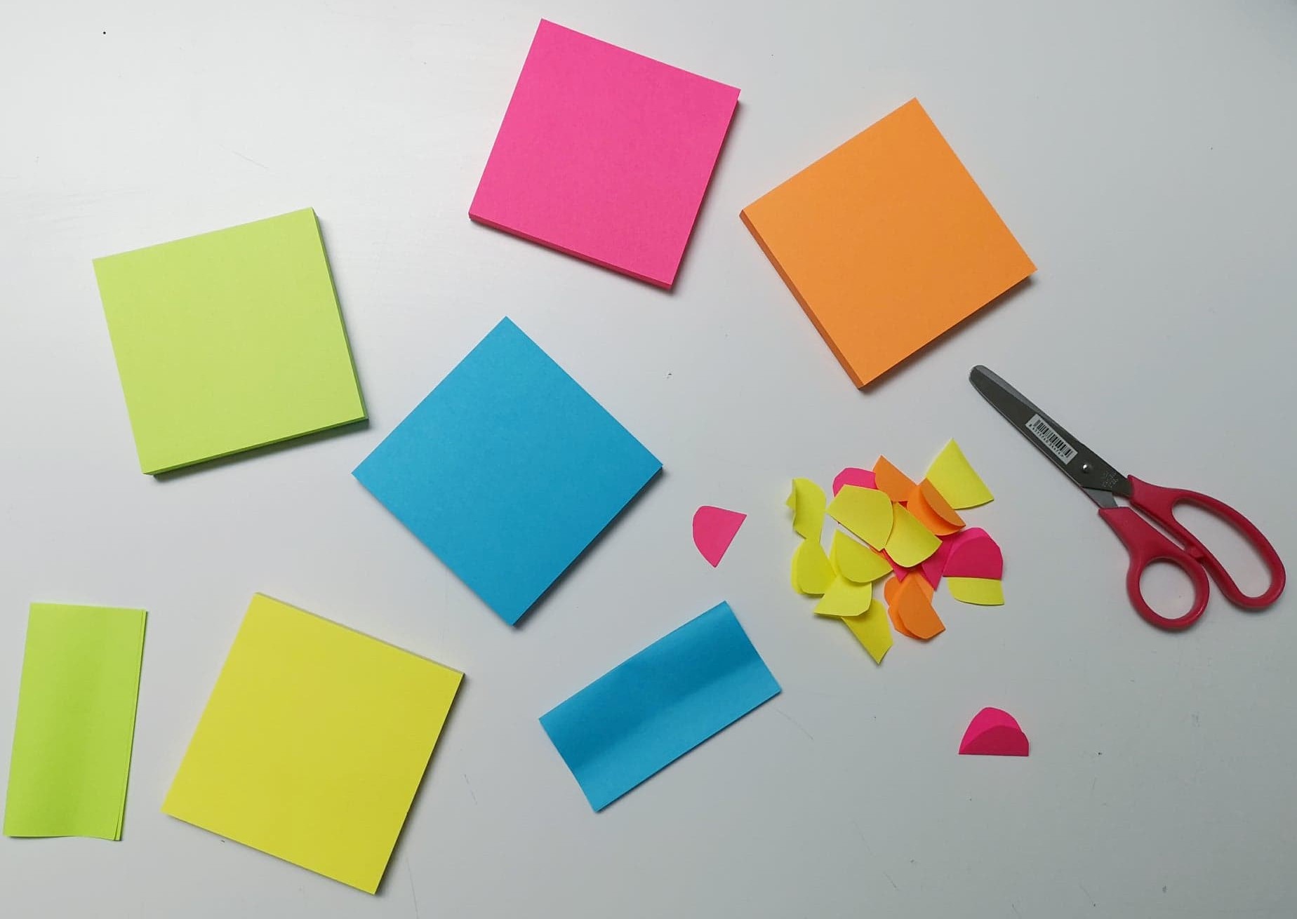 Pentru solzi folosim postit-uri colorate. Cu cât avem mai multe culori, cu atât vom obține un pește mai colorat. Noi am ales culorile galben, verde, albastru, roz și portocaliu. Luăm din fiecare culoare câte un postit, îl îndoim pe jumătate și tăiem solzii ca în imaginea de mai jos.
