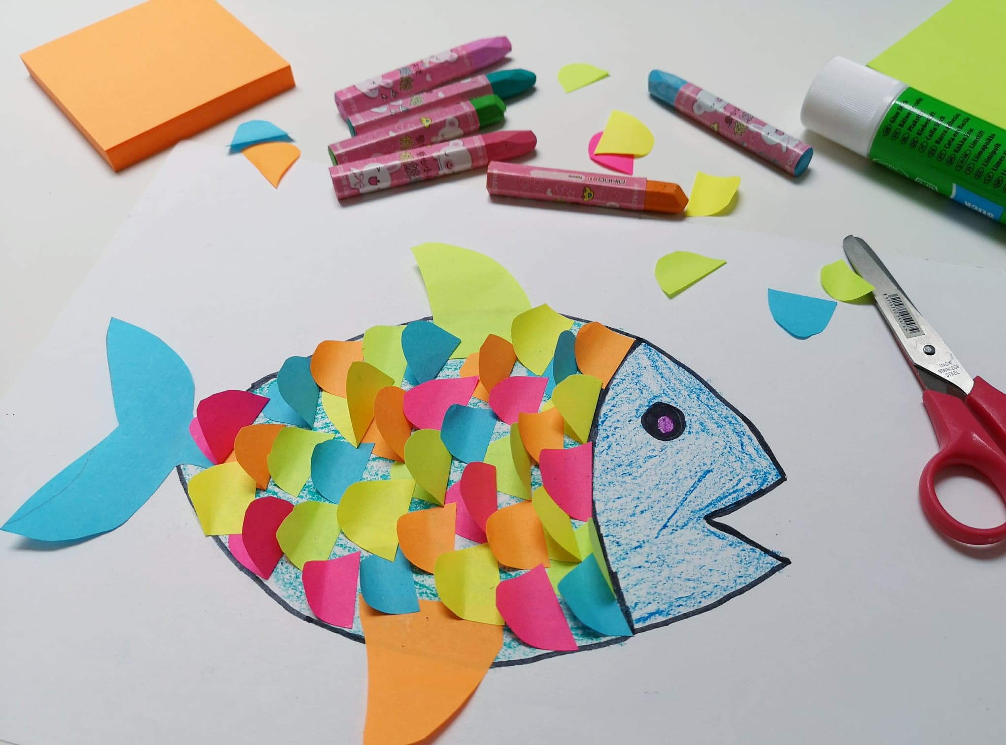 Pe trunchiul peștelui lipim solzii colorați, într-o ordine cât mai aleatorie. Pentru aripioare și codiță folosim aceleași postit-uri, decupate pe forma potrivită. La final, noi am ales să decupăm peștele de pe coala albă.