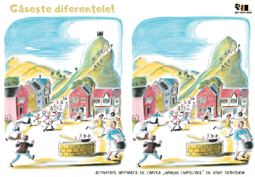 Undeva, pe un munte înalt, într-un castel mare și întunecat, trăia un Uriaș. Sătenii care locuiau la poalele muntelui erau îngroziți. La vederea lui, se baricadau în case și își astupau urechile cu palmele. Pentru că în mai toate poveștile, uriașii sunt răi, sunt căpcăuni hapsâni și nemiloși... Dar nu este obligatoriu ca orice uriaș să fie rău, ba din contră, cel din cartea Uriașul cumsecade, de Louis Slobodkin încearcă să câștige prietenia celor mici cu o fișă de activitate. Tu ai găsit cele 6 diferențe?