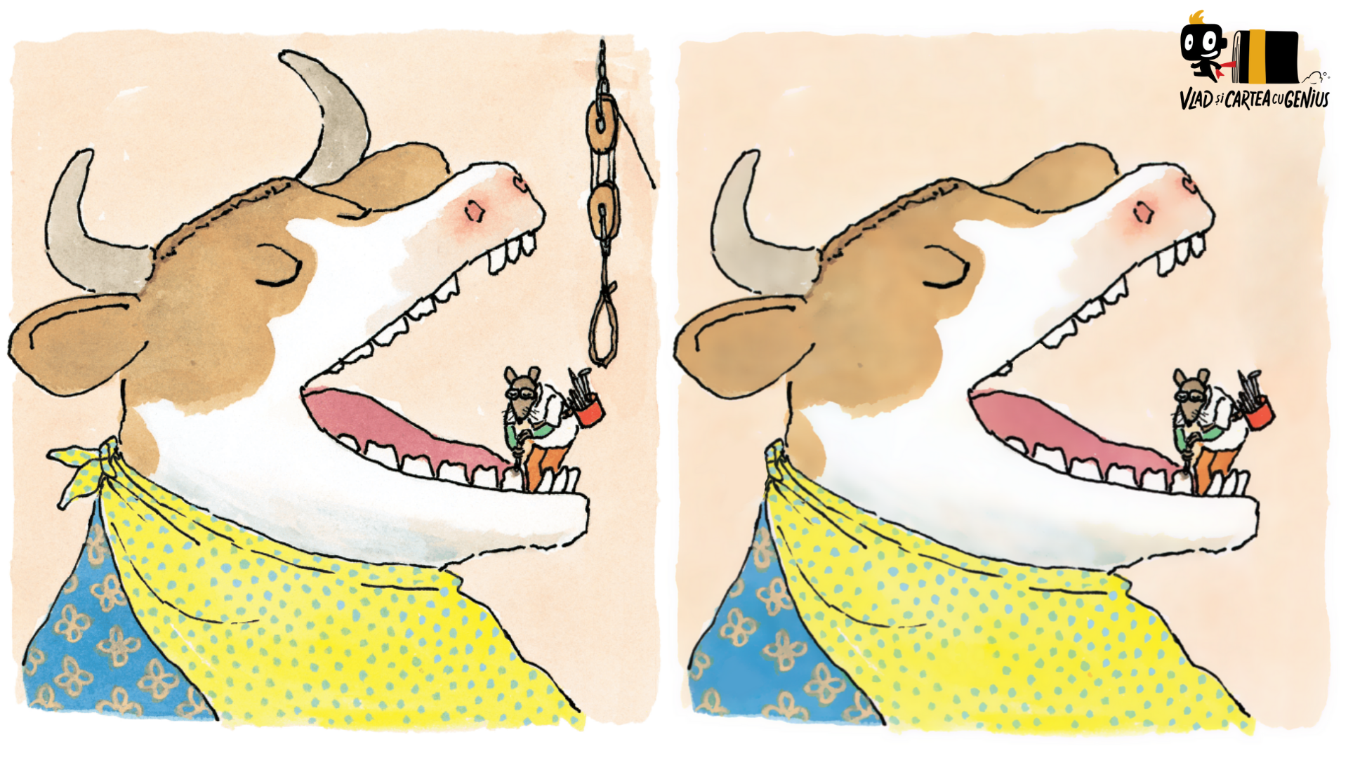 Celebrul Doctor De Soto, cel care tratează dinții animăluțelor fără pic de durere, a lansat o provocare în rândul prietenilor săi de la Vlad și Cartea cu Genius. Ne-a trimis o ilustrație din cartea sa, însoțită de mesajul Găsiți diferențele!