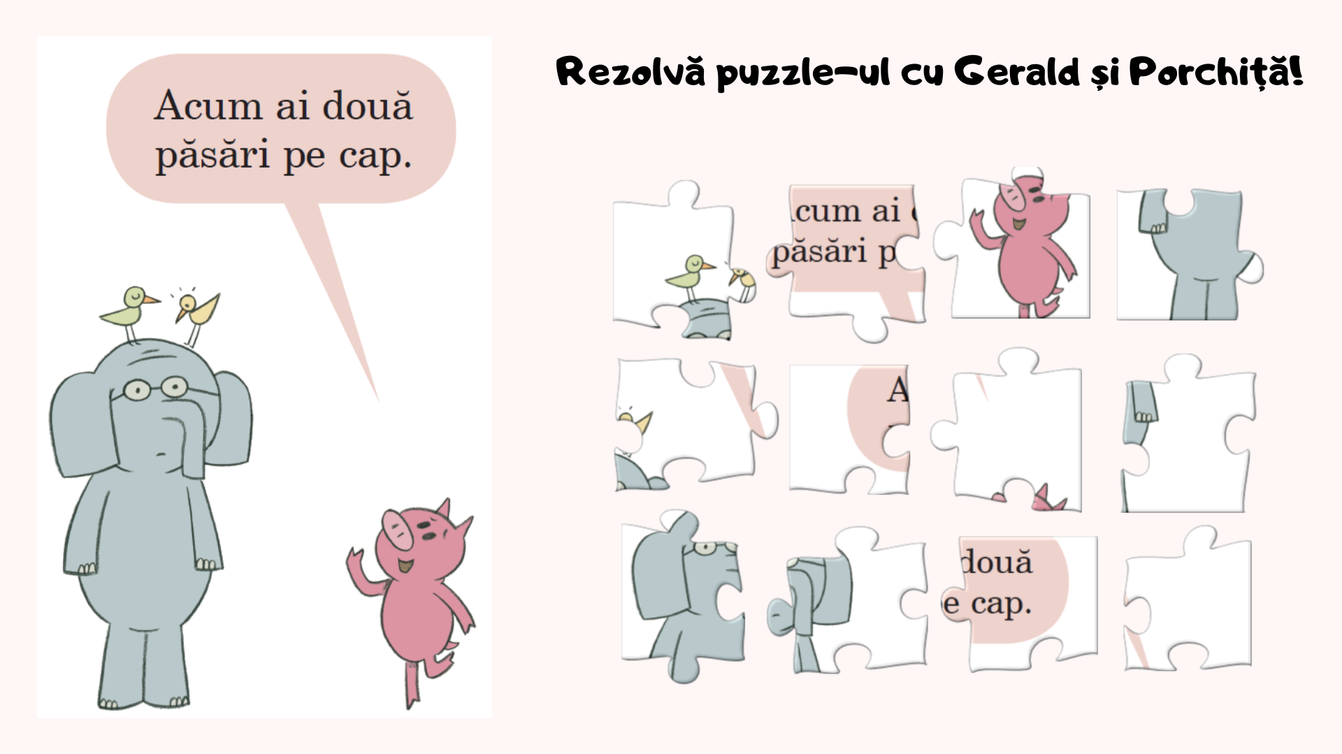 Ce faci dacă ești un elefant pe nume Gerald și o pasăre insistă să se cuibărească în capul tău? Îl chemi, desigur, pe Porchiță, cel mai bun prieten, să te scape de necaz. Dar dacă o ilustrație din cartea cu Gerald și Porchiță se transformă în piese de puzzle, ce faci? Îți chemi familia să te ajute să refaci imaginea din carte.