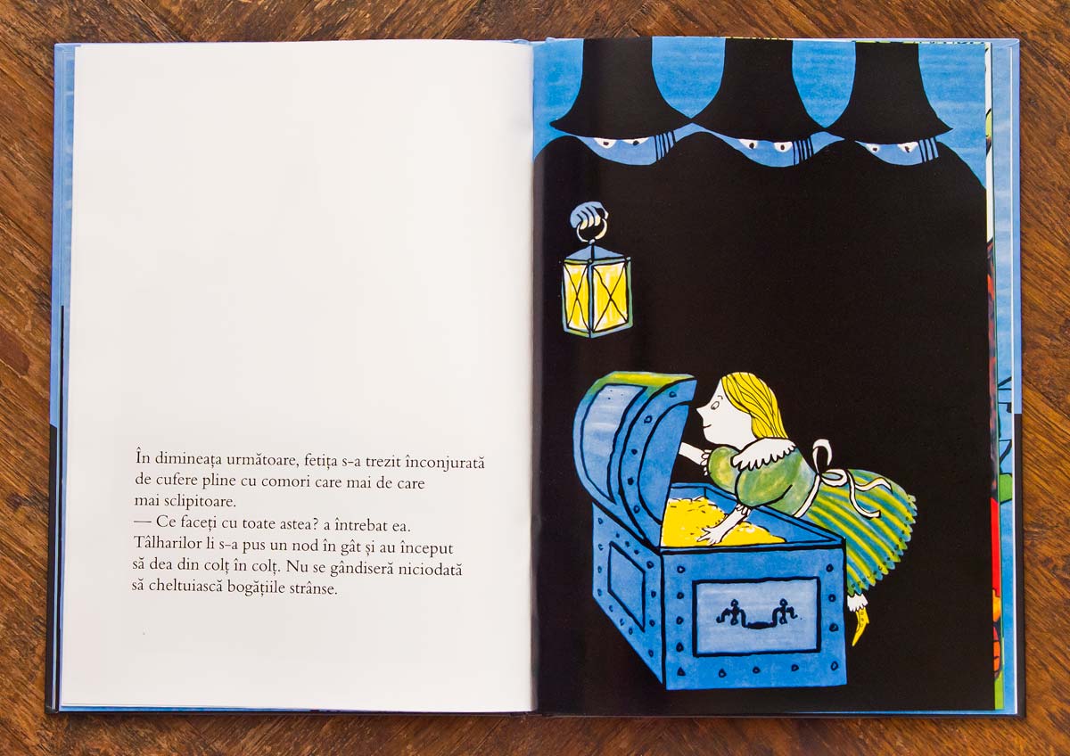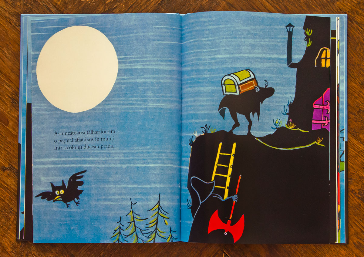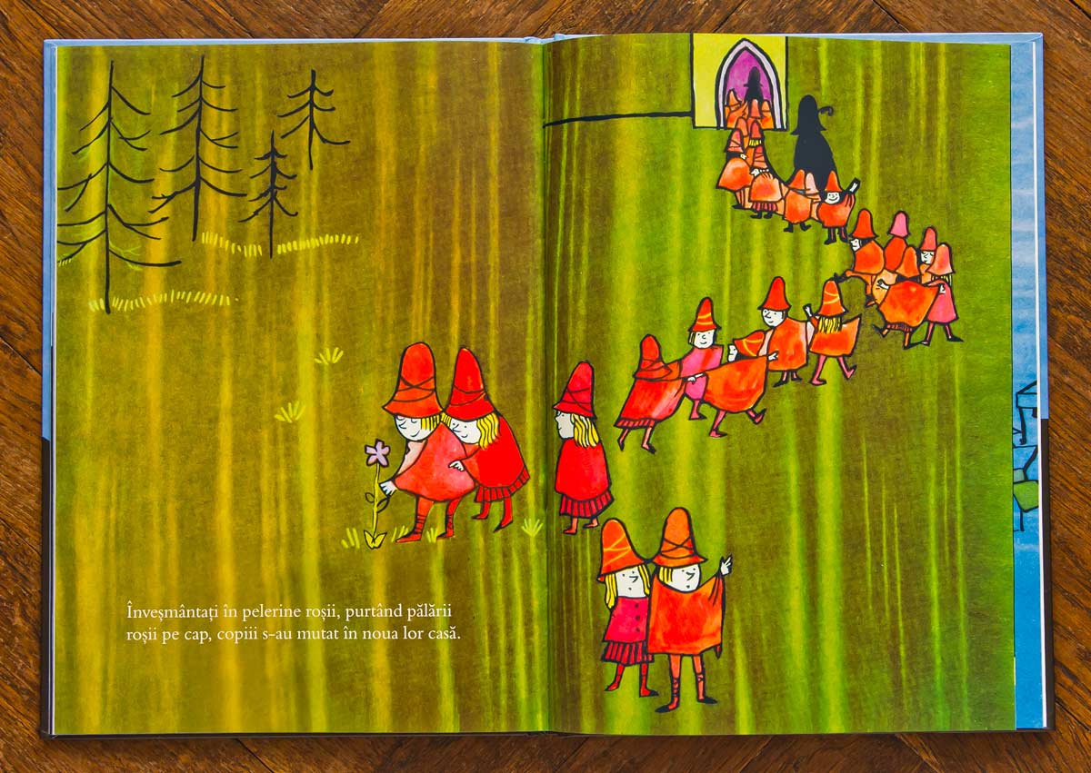 Pentru cei mici, frazele scurte și povestea simplă sunt foarte potrivite (eu mi-aș fi dorit mai mult text, evident), iar din această economie de cuvinte, autorul reușește să construiască o istorioară cu tâlc, în care trece de la registrul grav și sumbru la unul luminos și optimist. Schimbarea este percepută și la nivel cromatic, căci de la paginile în care predomină negrul ajungem spre final la cadre pline de culoare. Ilustrațiile mi s-au părut deosebite, mai ales felul în care Tomi Ungerer îi înfățișează pe tâlhari: înveșmântați în mantii negre, li se zăresc doar ochii sub pălăriile ciudate, care pe mine m-au dus cu gândul la niște bordeie. Este una dintre imaginile acelea iconice care vor rămâne întipărite peste ani în mintea micilor cititori, cum va rămâne probabil și această poveste despre influența pozitivă a inocenței și a bunăvoinței, care uneori fac să încolțească sămânța binelui pe un pământ ostil.