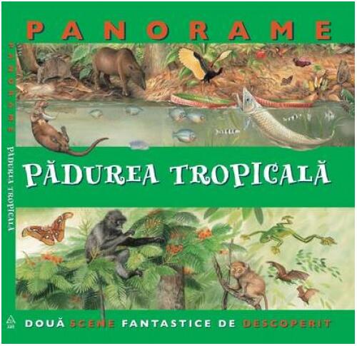 Deschide această carte şi vei avea pădurea tropicală desfăşurată în faţa ochilor! În interior găseşti două imagini panoramice, ambele de peste un metru lungime şi ilustrate cu detalii superbe. Una dintre ele înfăţişează viaţa din pădurea tropicală, de la înălţimea copacilor cu vârfurile însorite până la nivelul cel mai de jos, întunecos, al pădurii. Cealaltă te poartă într-o călătorie pe fluviul Amazon să vizitezi lumea vidrei gigant, a uimitorului anaconda, a caimanului cu ochelari şi a ucigaşilor piranha.